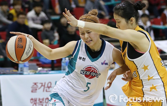 (부천=포커스뉴스) 6일 부천체육관에서 열린 2015-2016 여자프로농구 KEB하나은행-KB스타즈 경기에서 KEB하나 김이슬이 KB스타즈 홍아란의 밀착마크를 제치며 돌파를 시도하고 있다.
