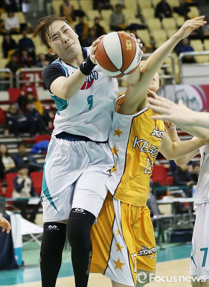 (부천=포커스뉴스) 6일 부천체육관에서 열린 2015-2016 여자프로농구 정규리그 마지막 경기 KEB하나은행-KB스타즈 경기에서 KEB하나 백지은이 KB스타즈 김가은에 앞서 리바운드볼을 잡고 있다.