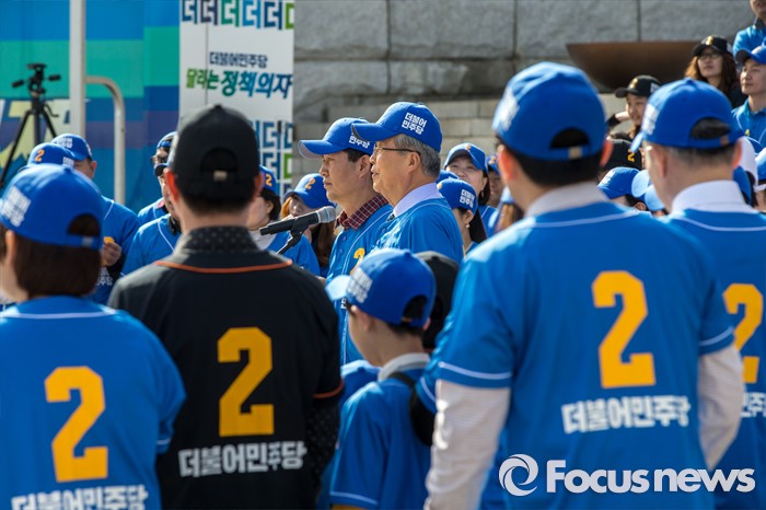 (서울=포커스뉴스) 김종인 더불어민주당 비상대책위원회 대표와 정청래 더불어민주당 의원을 비롯한 당원들이 6일 오후 서울 영등포구 국회 본관 앞에서 열린 '더불어민주당 총선 응원가 뮤직비디오 촬영'에 참여해 응원가를부르고 있다.