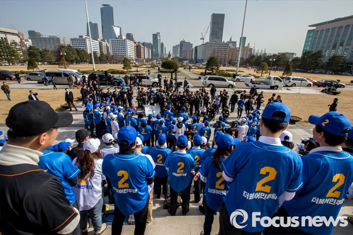 (서울=포커스뉴스) 김종인 더불어민주당 비상대책위원회 대표와 정청래 더불어민주당 의원을 비롯한 당원들이 6일 오후 서울 영등포구 국회 본관 앞에서 열린 '더불어민주당 총선 응원가 뮤직비디오 촬영'에 참여해 응원가를부르고 있다.