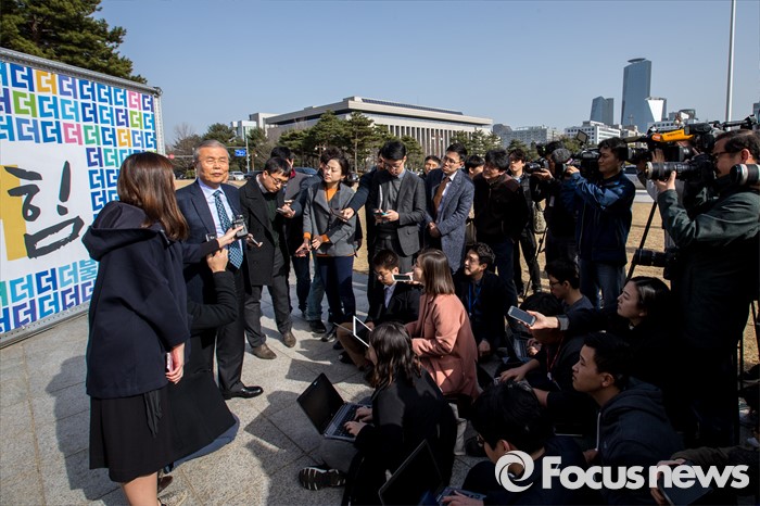 (서울=포커스뉴스) 김종인 더불어민주당 비상대책위원회 대표가 6일 오후 서울 영등포구 국회 본관 앞에서 열린 '더불어민주당 총선 응원가 뮤직비디오 촬영'에 참여해 촬영을 마친 뒤 취재진과 인터뷰 하고 있다.