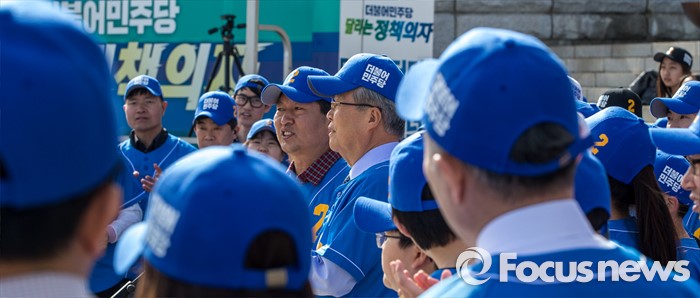(서울=포커스뉴스) 김종인 더불어민주당 비상대책위원회 대표와 정청래 더불어민주당 의원을 비롯한 당원들이 6일 오후 서울 영등포구 국회 본관 앞에서 열린 '더불어민주당 총선 응원가 뮤직비디오 촬영'에 참여해 응원가를부르고 있다.