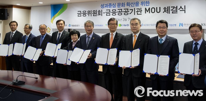(서울=포커스뉴스) 7일 오전 서울 중구 금융위원회 대회의실에서 열린 '성과중심 문화 확산을 위한 금융위원회-금융공공기관 MOU 체결식'에 참석한 임종룡 금융위원장과 금융공공기관장 및 관계자들이 기념촬영을 갖고 있다.