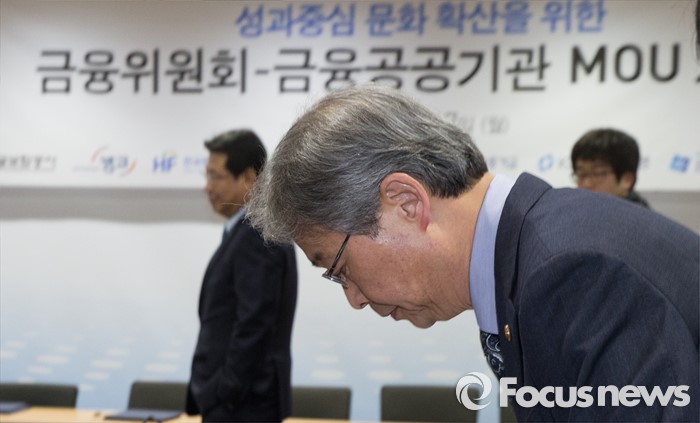 (서울=포커스뉴스) 7일 오전 서울 중구 금융위원회 대회의실에서 열린 '성과중심 문화 확산을 위한 금융위원회-금융공공기관 MOU 체결식'에 참석한 임종룡 금융위원장이 착석하고 있다.
