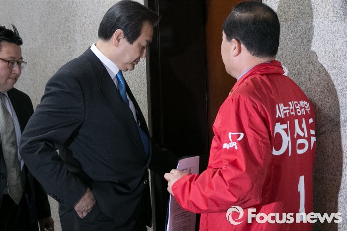(서울=포커스뉴스) 허성우(오른쪽) 새누리당 예비후보가 7일 오전 서울 여의도 국회 새누리당 대표최고위원실 앞에서 구미을 공천 탈락과 관련해, 피켓 시위를 하는 동안, 김무성 대표가 최고위원회의에 참석하고 있다.