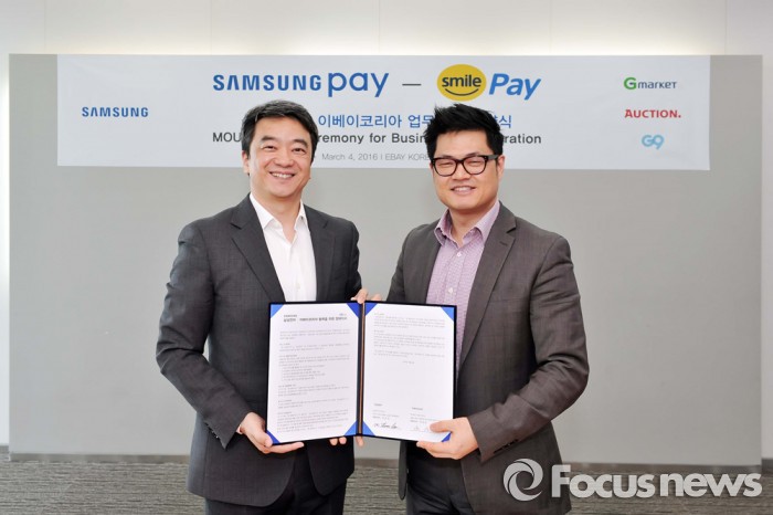 (서울=포커스뉴스) G마켓과 옥션을 운영하고 있는 이베이코리아는 지난 4일 역삼동 GFC타워에서 삼성전자와 온·오프라인 핀테크 활성화를 위한 양해각서(MOU)를 체결했다.