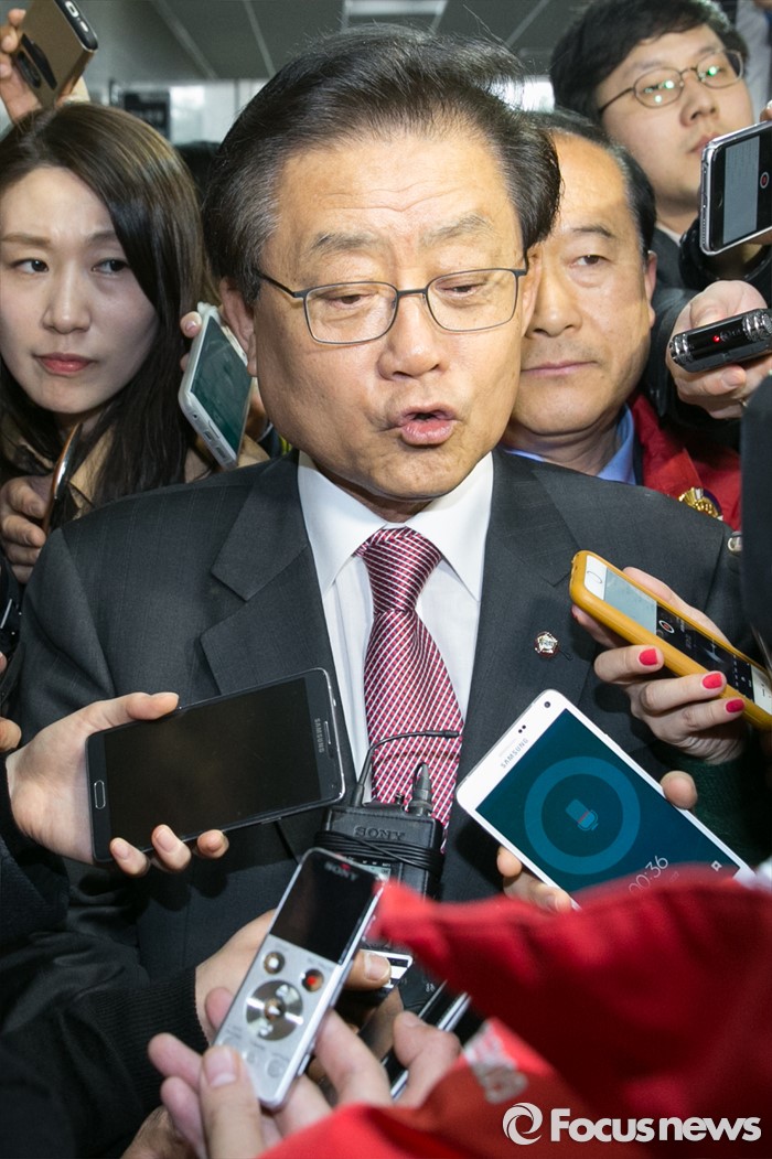 (서울=포커스뉴스) 공천 탈락 통보를 받은 김태환 새누리당 의원이 7일 오전 서울 여의도 국회에서 열린 최고위원회의에 참석한 뒤, 기자들의 질문에 답하며 밖으로 나가고 있다.