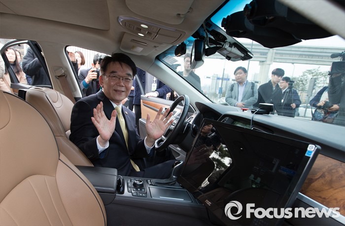 (세종=포커스뉴스) 7일 오전 세종시 정부세종청사 국토교통부 앞에서제1호 자율주행차 시험운행 허가 및 시연이 열린 가운데 현대 제네시스가 국내 자율주행차 임시운행 제1호차로 허가받고 도로주행을 시작했다. 강호인 국토교통부장관이 시범운행차량을 시승하고 있다.