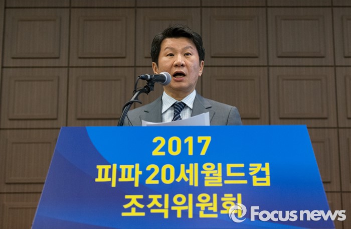 (서울=포커스뉴스) 7일 오전 서울 중구 프레스센터에서 2017 피파 20세 월드컵조직위원회 창립총회에 참석한 정몽규 대한축구협회장이 인사말을 하고 있다.