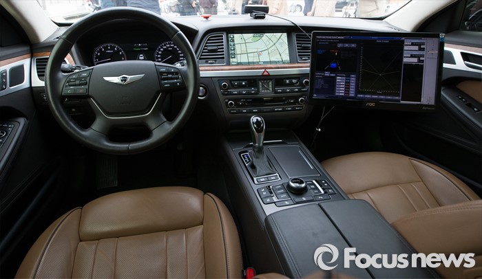 (세종=포커스뉴스) 7일 오전 세종시 정부세종청사 국토교통부 앞에서제1호 자율주행차 시험운행 허가 및 시연이 열린 가운데 현대 제네시스가 국내 자율주행차 임시운행 제1호차로 허가받고 도로주행을 시작했다. 사진은 자율주행 시험차량.