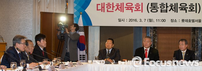 (서울=포커스뉴스) 7일 서울 중구 롯데호텔앤리조트 서울에서 열린 '대한체육회(통합체육회) 발기인 대회'에서 이동현(맨 왼쪽) 통합준비위원회 위원이 발언을 하고 있다.