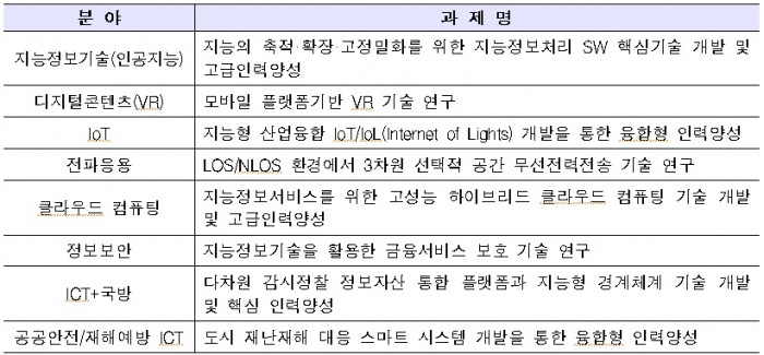 특히 올해는 기술특화 전문인력 기반이 취약한 국방 ICT 분야의 정책 수요를 반영해 국방ICT에 특화된 연구개발 및 전문인력 양성을 위한 과제를 추진한다. 기업의 애로기술을 해결하기 위한 기업수요중심(공공안전·재해예방 ICT분야) 신규과제도 추진한다.