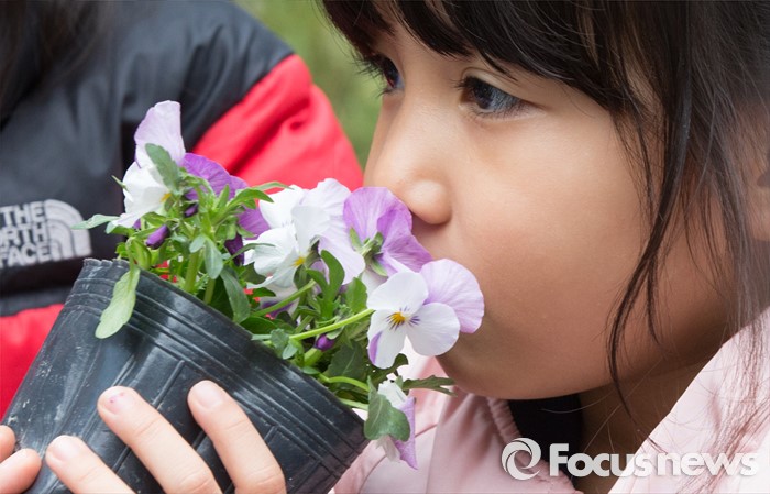 (세종=포커스뉴스) 7일 오후 세종시 정부세종청사 농림축산식품부 앞 다솜동산에서 어린이가 팬지향을 맡고 있다.