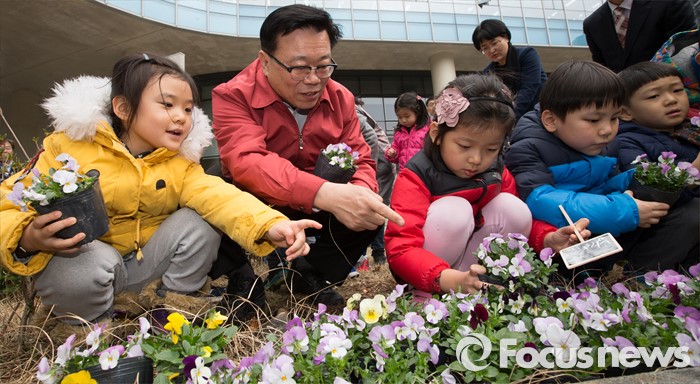 (세종=포커스뉴스) 7일 오후 세종시 정부세종청사 농림축산식품부 앞 다솜동산에서 이동필 농림축산식품부장관이 어린이들과 튤립 및 백합의 구근과 팬지를 심고 있다.