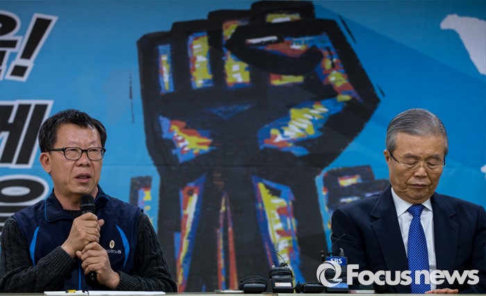 (서울=포커스뉴스) 7일 오후 서울 중구 민주노총 사무실에서 최종진(왼쪽) 민주노총 위원장직무대행이 김종인 더불어민주당 비상대책위원회 대표를 만나 인사말을 하고 있다.
