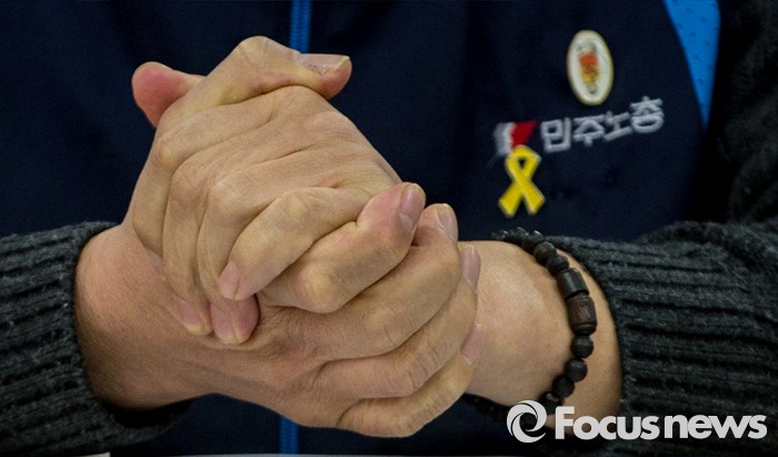 (서울=포커스뉴스) 7일 오후 서울 중구 민주노총 사무실에서 최종진 민주노총 위원장직무대행이 김종인 더불어민주당 비상대책위원회 대표를 기다리며 두 손을 맞잡고 있다.