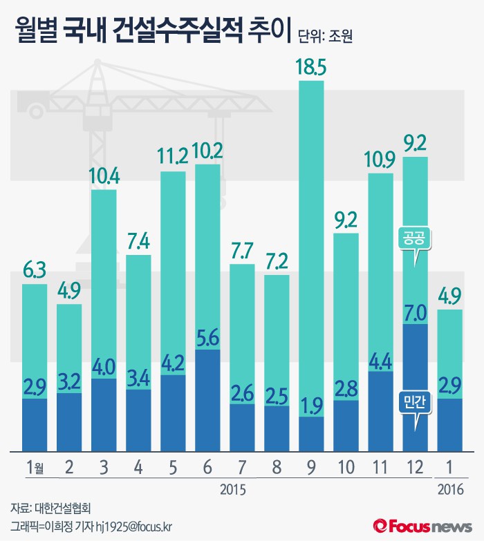 (서울=포커스뉴스) 7일 대한건설협회의 발표에 따르면 1월 국내건설공사 수주액은 7조8815억원이다. 이 가운데 공공부문 수주액은 2조9438억원, 민간부문 수주액은 4조9377억원이다.