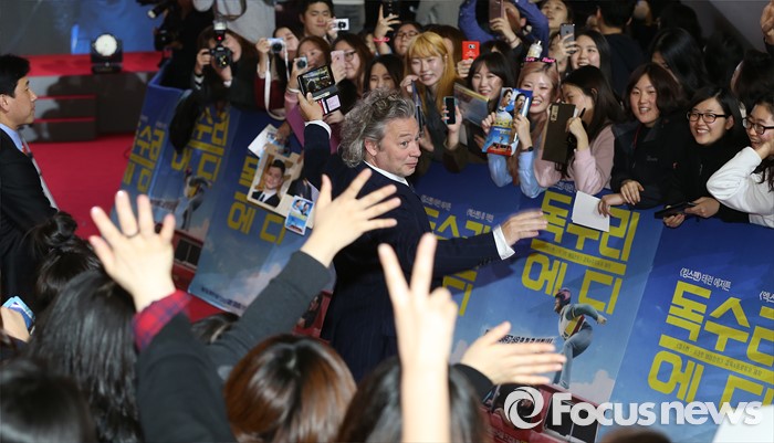 (서울=포커스뉴스) 7일 오후 서울 영등포구 IFC몰 광장에서 열린 영화 '독수리 에디' 레드카펫 행사에 참석한 덱스터 플레처 감독이 팬들을 촬영하고 있다.