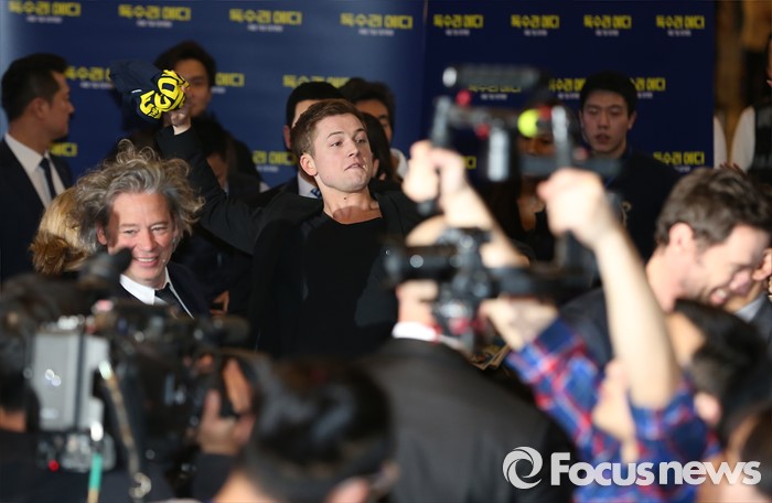 (서울=포커스뉴스) 7일 오후 서울 영등포구 IFC몰 광장에서 열린 영화 '독수리 에디' 레드카펫 행사에 참석한 배우 태론 에거튼이 팬들에게 선물을 던지고 있다.