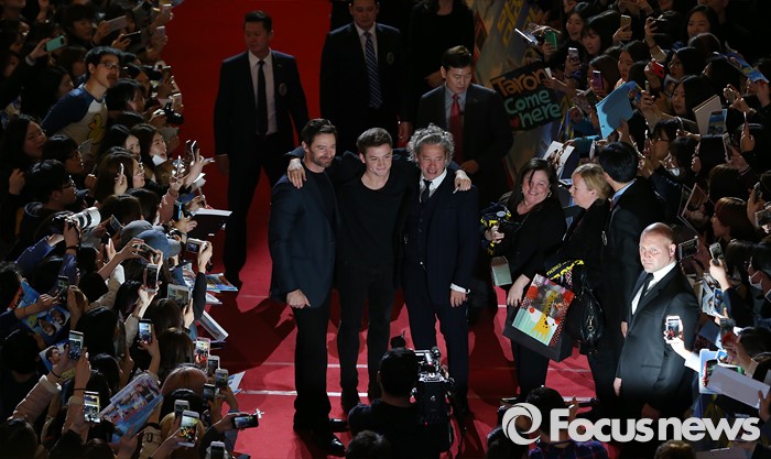 (서울=포커스뉴스) 7일 오후 서울 영등포구 IFC몰 광장에서 열린 영화 '독수리 에디' 레드카펫 행사에 참석한 배우 휴 잭맨(왼쪽부터), 태론 에거튼, 덱스터 플레처 감독이 기념사진 촬영을 하고 있다.