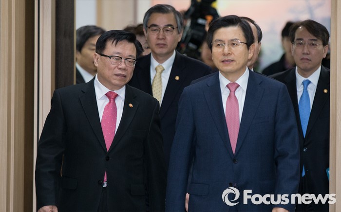 (세종=포커스뉴스) 황교안 국무총리가 이동필 농림축산식품부장관과 8일 오전 세종시 정부세종청사 국무회의장에서 서울-세종 영상회의로 열린 국무회의에 입장하며 대화하고 있다.