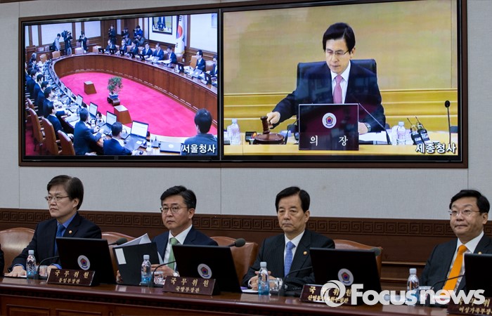 (서울=포커스뉴스) 8일 오전 서울 종로구 정부서울청사에서 열린 국무회의에 황교안 국무총리의 의사봉 두드리는 모습이 화상을 통해 전달되고 있다.