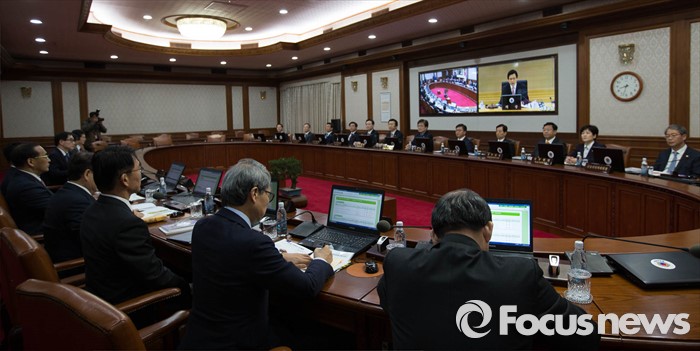 (서울=포커스뉴스) 황교안 국무총리가 8일 오전 정부서울청사에서 열린 국무회의에 화상을 통해 참석하고 있다. 2016-03-08