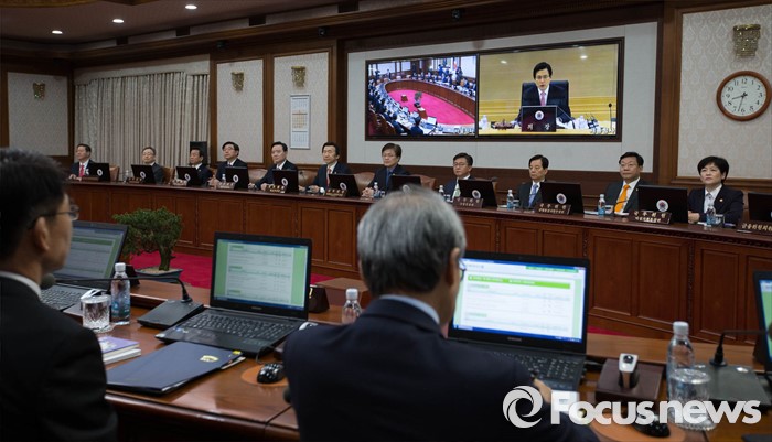 (서울=포커스뉴스) 황교안 국무총리가 8일 오전 정부서울청사에서 열린 국무회의에 화상을 통해 참석하고 있다. 2016-03-08