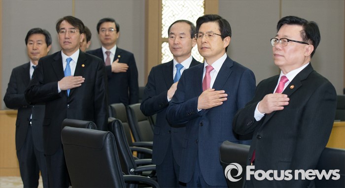 (세종=포커스뉴스) 황교안 국무총리와 국무위원들이 8일 오전 세종시 정부세종청사 국무회의장에서 서울-세종 영상회의로 열린 국무회의에 참석해 국기에 대한 경례를 하고 있다.