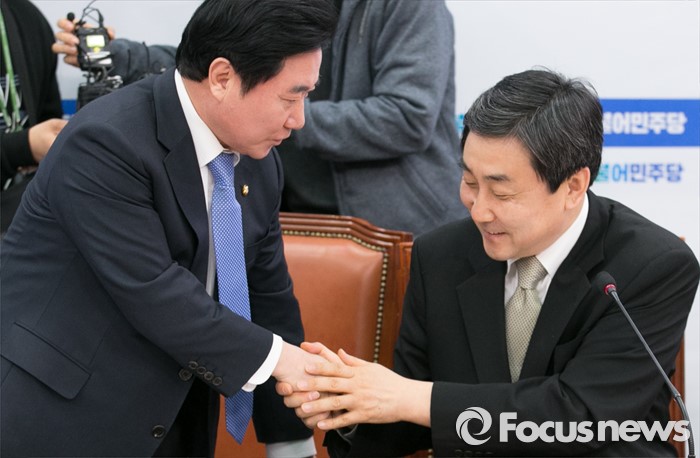 (서울=포커스뉴스) 이종걸(오른쪽) 더불어민주당 원내대표와 이석현 국회 부의장이 8일 오전 서울 여의도 국회에서 열린 원내대책회의에 참석해 인사하고 있다.