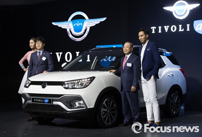 (서울=포커스뉴스) 8일 오전 서울 서초구 세빛섬에서 최종식(오른쪽 두번째) 쌍용자동차 대표이사와 홍봉석(왼쪽 두번째) 쌍용자동차 노조위원장이 티볼리 에어 신차발표회에 참석해 기념촬영을 하고 있다.