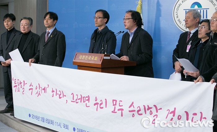 (서울=포커스뉴스) 8일 오전 서울 여의도 국회 정론관에서 야권의 단합과 2016년 총선 승리를 위한 수도권연대 회원들이 발족 및 야권 단일화를 촉구하는 기자회견을 하고 있다.