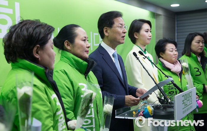 (서울=포커스뉴스) 국민의당 천정배 공동대표가 8일 오후 서울 마포구 국민의당 당사에서 여성 예비후보들에게 꽃을 선물한 후 여성 정책발표를 하고 있다.