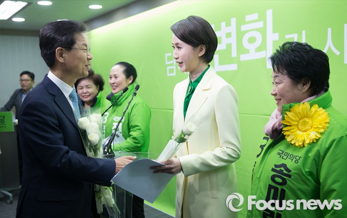 (서울=포커스뉴스) 국민의당 천정배 공동대표가 8일 오후 서울 마포구 국민의당 당사에서 여성 정책발표를 마친 후 여성 예비후보들에게 꽃을 선물하고 있다.