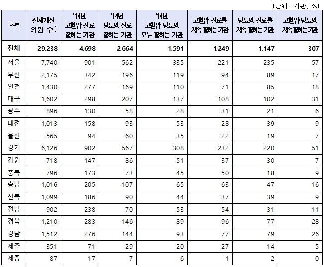 2014년도 전체 개설의원(2만9238개소) 중 고혈압 진료를 잘하는 기관은 4698개소, 당뇨병 진료를 잘하는 기관은 2664개소, 고혈압·당뇨병 모두 잘하는 기관은 1591개소로 나타났다.