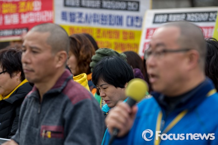 (서울=포커스뉴스) 8일 오후 서울 영등포구 국회 앞에서 열린 '19대 국회 세월호 특별법 개정안 특검 처리 촉구 기자회견'에 참석한 4.16가족협의회 및 관련 시민단체 관계자들이 정부에 세월호 참사 특검처리 약속 이행을 촉구 하고 있다.