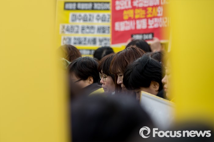 (서울=포커스뉴스) 8일 오후 서울 영등포구 국회 앞에서 열린 '19대 국회 세월호 특별법 개정안 특검 처리 촉구 기자회견'에 참석한 4.16가족협의회 및 관련 시민단체 관계자들이 정부에 세월호 참사 특검처리 약속 이행을 촉구 하고 있다.