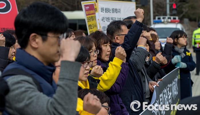 (서울=포커스뉴스) 8일 오후 서울 영등포구 국회 앞에서 열린 '19대 국회 세월호 특별법 개정안 특검 처리 촉구 기자회견'에 참석한 4.16가족협의회 및 관련 시민단체 관계자들이 정부에 세월호 참사 특검처리 약속 이행을 촉구 하고 있다.