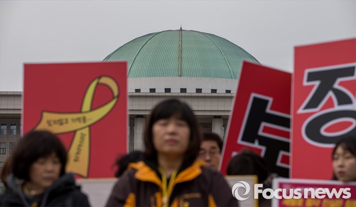 (서울=포커스뉴스) 8일 오후 서울 영등포구 국회 앞에서 열린 '19대 국회 세월호 특별법 개정안 특검 처리 촉구 기자회견'에 참석한 4.16가족협의회 및 관련 시민단체 관계자들이 정부에 세월호 참사 특검처리 약속 이행을 촉구 하고 있다.