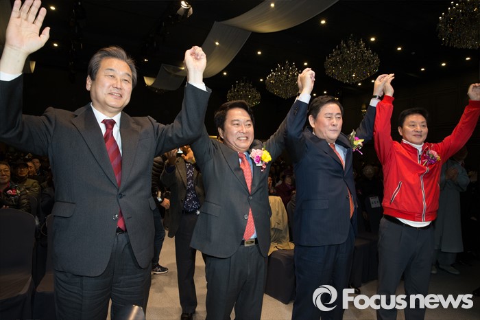 | △ 손잡고 당원들에게 인사하는 김무성-최경환-이성헌 |