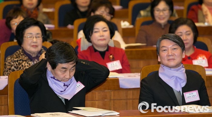 (서울=포커스뉴스) 8일 오후 서울 여의도 국회 헌정기념관에서 열린 세계 여성의 날 기념대회에 참석한 이종걸 더불어민주당 원내대표가 퍼포먼스용 스카프를 매고 있다. 오른쪽은 안철수 국민의당 상임공동대표.