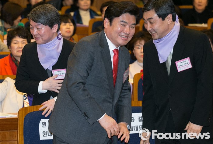 (서울=포커스뉴스) 8일 오후 서울 여의도 국회 헌정기념관에서 열린 세계 여성의 날 기념대회에 참석한 안철수 국민의당 상임공동대표가 먼저 퇴장하고 있다. 왼쪽부터 안 상임공동대표, 원유철 새누리당 원내대표, 이종걸 더불어민주당 원내대표.