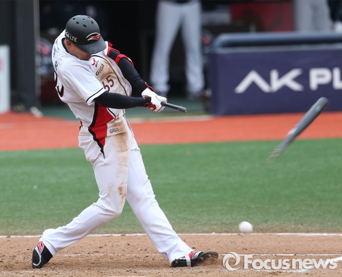 (수원=포커스뉴스) 8일 수원 kt위즈파크에서 열린 2016 KBO리그 시범경기 두산-kt 경기에서 9회 kt 문병옥의 타격때 배트가 부러지며 볼과 함께 날아가고 있다.