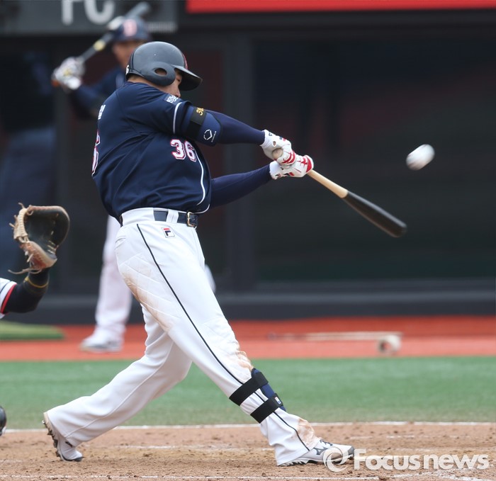 (수원=포커스뉴스) 8일 수원 kt위즈파크에서 열린 2016 KBO리그 시범경기 두산-kt 경기에서 9회 두산 오재일이 타격하고 있다.