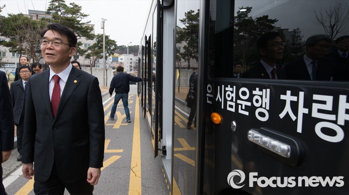 (청주=포커스뉴스) 강호인 국토교통부 장관이 8일 오후 청주시 청원구 오창읍 충북테크노파크에서 열린 차세대 도로교통용 정밀위성항법(GPS) 시연회에서 정밀차로구분 네비게이션이 설치된 바이모달트램을 시승 하고 있다.