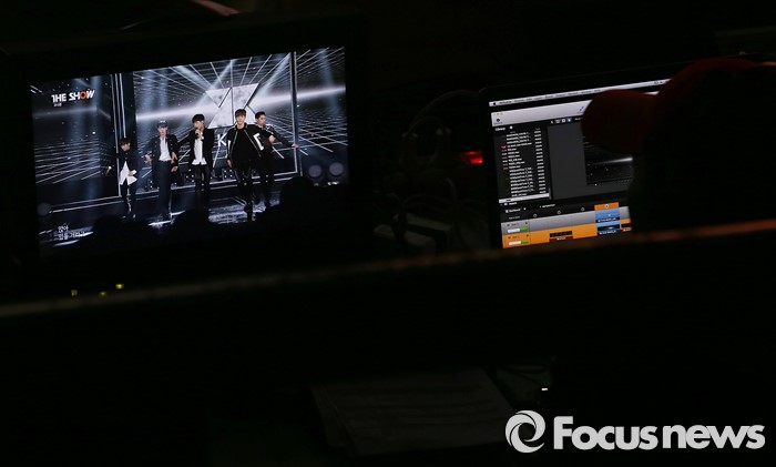 (서울=포커스뉴스) 8일 오후 서울 마포구 SBS프리즘 타워에서 열린 '2016 더쇼 62회' 생방송 촬영 현장에 한 제작진이 아이돌 그룹 크나큰의 무대를 바라보고 있다.