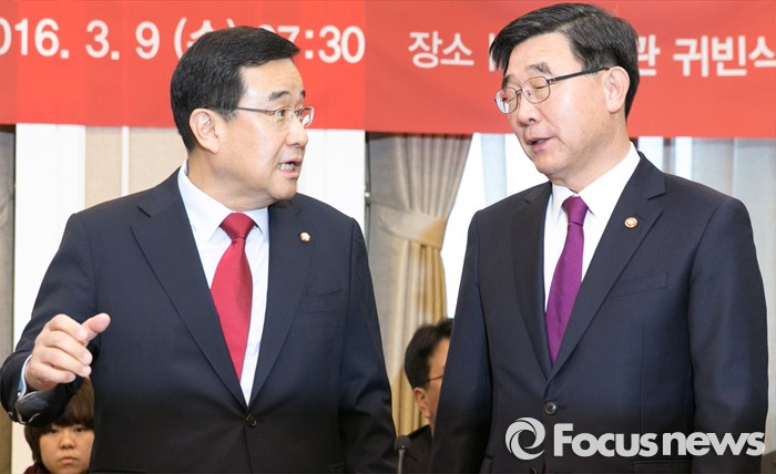 (서울=포커스뉴스) 9일 오전 서울 여의도 국회 귀빈식당에서 열린 경제활성화를 위한 민·당·정 간담회에 참석한 김정훈(왼쪽) 새누리당 정책위의장과 이기권 고용노동부 장관이 대화하고 있다.