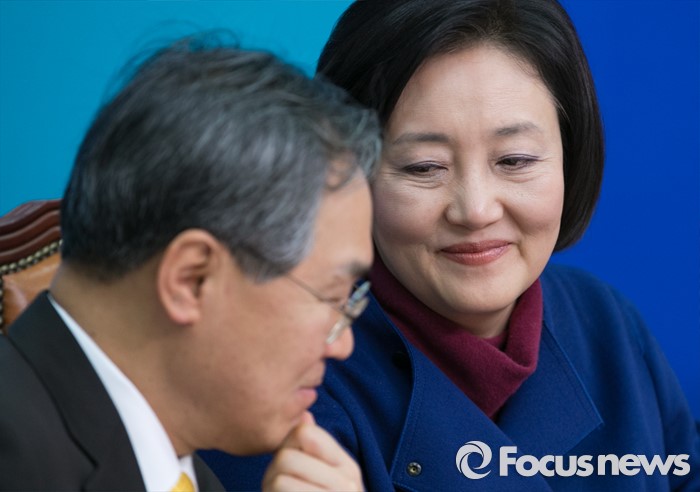(서울=포커스뉴스) 우윤근(왼쪽), 박영선 더불어민주당 비대위원이 9일 오전 서울 여의도 국회에서 열린 비상대책위원회의에 참석해 대화하고 있다.