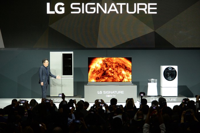LG전자 중국법인장 이혜웅 부사장은 “세계 최고 수준의 가전 기술력과 중국 소비자 생활상을 고려한 편의성을 모두 갖춘 혁신 제품으로 고객의 마음을 사로잡을 것”이라고 강조했다.LG전자 CTO 안승권 사장이 LG시그니처 냉장고, LG 시그니처 올레드 TV, LG 시그니처 공기청정기, LG 시그니처 세탁기를 소개하고 있다. <사진제공=LG전자> 2016.01.05 박나영 기자