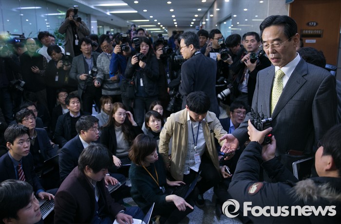 (서울=포커스뉴스) 홍창선 더불어민주당 공천관리위원장이 9일 오전 서울 여의도 국회 정론관에서 20대 총선 1차 경선지역과 관련 브리핑을 마친 뒤 취재진 질문에 답하고 있다. 홍 위원장은 이날 브리핑 중 취재관행을 바꾸기 위한 언론인과 대화를 하던 중 일부 항의를 받았다.